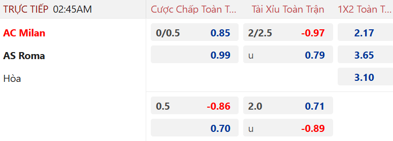 Tỷ lệ hiệp 1 AC Milan chấp dao động giữa giá và 1/4, trong khi tài xỉu cũng chỉ là 3/4 ăn ít (1 hòa bỏ sâu cho lựa chọn tài). Hàng công của AC Milan chưa hiệu quả khi quá phụ thuộc vào Leao, còn AS Roma tỏ ra chắc chắn với việc giữ sạch lưới trong hiệp 1 ở 8/9 trận sân khách gần đây. Vì thế, khó có sự cởi mở ở hiệp đấu thứ nhất trận này.