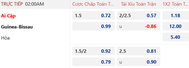 Tỷ lệ hiệp 1 trận này cửa trên chấp 3/4 ăn cao nhưng tài xỉu lại chỉ có 1 hòa. Điều đó khó mang đến hy vọng về sự cởi mở, khi cả 2 đội xác định chơi cho đủ thủ tục. Ai Cập công cũng không quá ấn tượng nhưng họ thủ tốt và chơi thực dụng. Guinea Bissau thì 3 trận liền không thể ghi bàn ở hiệp 1.