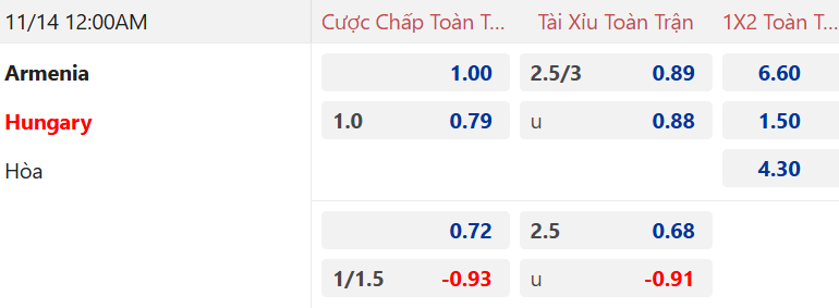 Dù chấp 1 hòa nhưng thực tế Hungary không hẳn là điểm đến đáng tin cậy ở trận cầu này. Sở dĩ nói vậy vì nếu nhìn vào kèo hiệp 1, có thể thấy sự chênh lệch khá lớn. Armenia không phải cái tên quá tệ khi được chơi ở sân nhà. Đừng quên là tại lượt trận thứ 2 thì Armenia từng đánh bại CH Ireland tại tổ ấm của mình.