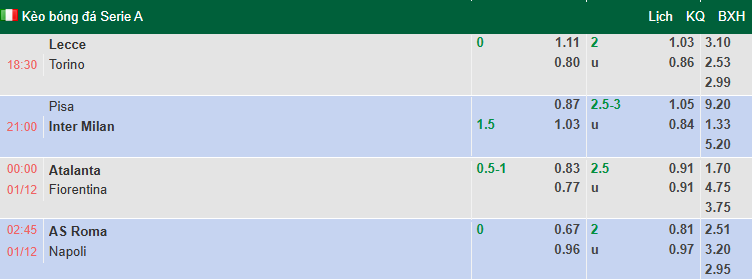 Đây là cuộc đối đầu giữa hai đội bóng đang rất khát khao chiến thắng tại giải quốc nội: Atalanta vừa thắng lớn ở Champions League nhưng đã 8 trận Serie A không biết mùi chiến thắng, còn Fiorentina đang chìm trong khủng hoảng với chuỗi 7 trận không thắng trên mọi đấu trường và xếp thứ 17 trên bảng xếp hạng. Với kèo handicap 0:3/4, đội chủ nhà được tin tưởng sẽ giải tỏa cơn khát 3 điểm.
