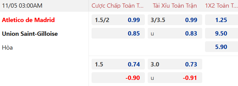 Tỷ lệ hiệp 1 Atletico Madrid đã chấp đến 3/4, nhưng tài xỉu HT lại chỉ có 1 1/4 là mức hơi thấp, khó mang đến sự tưng bừng trong hiệp đấu thứ nhất. Atletico Madrid vẫn chơi theo hướng thực dụng và 3/4 trận gần đây của họ đều không có bàn nào trong hiệp 1. Saint-Gilloise cũng đã cải thiện đáng kể khả năng phòng ngự khi giữ sạch lưới hiệp 1 ở cả 3 trận vừa qua.