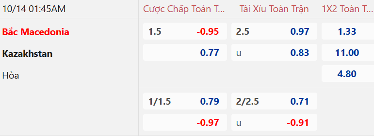 Tỷ lệ hiệp 1 trận này ở mức chủ chấp hòa trong khi tài xỉu là 1 hòa. Bắc Macedonia bắt nhịp một cách thận trọng và 2 trận vừa qua họ không thủng lưới trong hiệp 1. Kazakhstan thường khởi đầu không tốt và 2 trận sân khách mới đây họ đều thua ở thời gian HT. Lịch sử cũng ghi nhận trong 2 cuộc đối đầu trước đây thì Bắc Macedonia đều thắng ở hiệp 1.