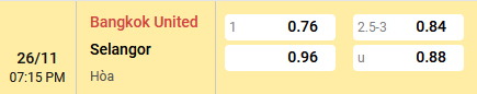 Nhà cái đang niêm yết mức kèo 0:1 và nó chứng tỏ Bangkok United được đánh giá cao hơn Selangor rất nhiều. Đây là tỷ lệ kèo nên nằm nhà Á quân giải Thái Lan bởi họ thắng kèo 3/4 trận thi đấu ở đấu trường Cup C2. Trong khi đó, Selangor thua kèo cả 4 trận ra quân ở đấu trường AFC Cup. Đáng chú ý là thảm bại 2-4 ngay trên sân nhà trước Bangkok United ở trận lượt đi.