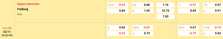 Nhà cái đang niêm yết mức kèo 0:2 1/4 và nó cho thấy sự chênh lệch về đẳng cấp giữa 2 đội. Đây là tỷ lệ kèo vẫn nên đặt niềm tin vào đội chủ nhà Bayern Munich bởi họ thắng kèo tới 11/13 trận vừa qua trên mọi sân chơi. Đáng chú ý, Hùm xám xứ Bavaria thắng kèo 6/7 trận khi được thi đấu dưới mặt sân quen thuộc và thắng kèo cả 4 trận khi chấp kèo từ 2 trái trở lên. Trong khi đó, Freiburg chỉ thắng kèo 1 trong 5 trận xa nhà tại sân chơi giải VĐQG Đức.