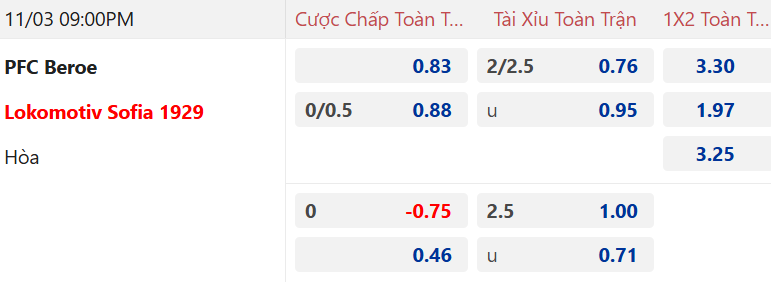 Tỷ lệ hiệp 1 trận này Lokomotiv Sofia chấp về giá ăn ít, trong khi tài xỉu nhà cái đưa ra ở mức 1 hòa. Với handicap như vậy thì nên tin vào khách trong hiệp 1. Thống kê chỉ ra rằng trong 4 lần đối đầu gần đây, Lokomotiv Sofia chưa từng thua Beroe khi thời gian HT khép lại, thậm chí 3 trận thì họ còn tạo ra ưu thế dẫn bàn trước Beroe.