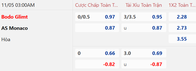 Sàn châu Á chứng kiến tỷ lệ Bodo Glimt chấp 1/4 trận này với điểm ăn cao hơn cửa dưới. Khách quan mà nói, việc 1 đội bóng của Na Uy sắm vai cửa trên trước đại diện Pháp – Monaco cũng là tỷ lệ rất khả quan dành cho Bodo Glimt. Bodo Glimt có 4 lần vượt qua rào cản handicap trong 5 trận sân nhà vừa qua, còn Monaco lại chỉ thắng kèo có 1 lần ở 7 trận sân khách mới nhất.