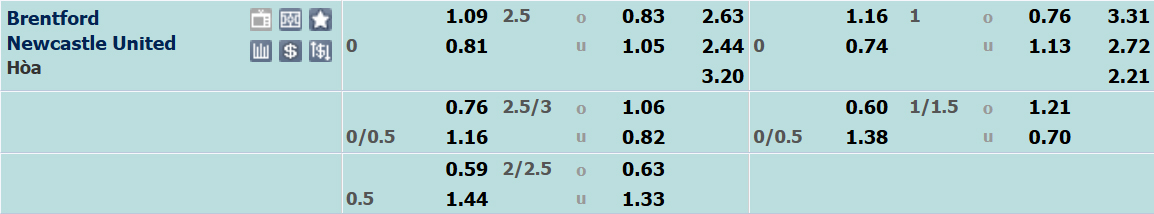 Trận đấu này được đánh giá cân bằng với tỉ lệ 0:0. Newcastle có thành tích đối đầu tốt hơn hẳn so với Brentford. Nhưng với phong độ không tốt trên sân khách ở Ngoại hạng Anh mùa này, thầy trò Eddie Howe không phải lựa chọn đáng tin cậy.