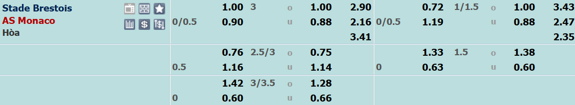 AS Monaco được xếp ở cửa trên với tỉ lệ 1/4:0 nhưng không đáng tin tưởng bởi qua 6 trận sân khách ở Ligue 1 mùa này, họ đã thua 4 trận theo tỉ lệ châu Á. Trong khi đó, Brest đã lấy lại niềm tin khi thắng cả 2 vòng đấu gần nhất theo cả tỉ số chuyên môn lẫn tỉ lệ châu Á.