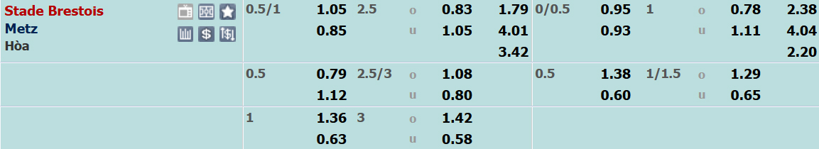 Nhờ ưu thế sân nhà, Brest được xếp ở cửa trên với tỉ lệ 0:3/4. Dù vậy, thầy trò Eric Roy không đáng tin tưởng bởi họ chỉ biết hòa và thua ở 6 vòng đấu gần nhất, trong đó có 4 trận thua kèo châu Á. Ngược lại, Metz đã thắng cả 3 vòng đấu gần đây theo cả tỉ số chuyên môn lẫn handicap.