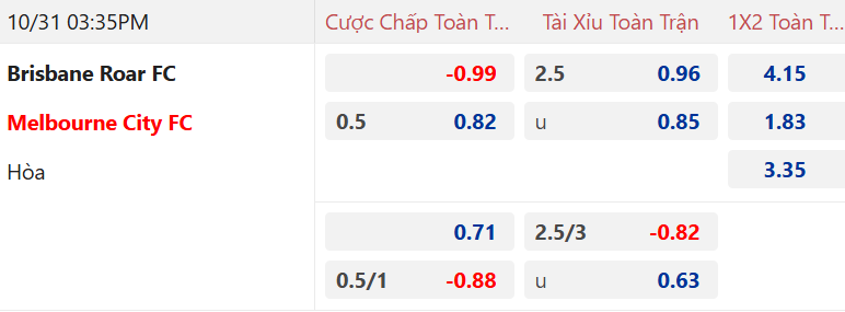 Kèo hiệp 1 trận này khách chấp 1/4 và tài xỉu HT là 1 hòa. Ở 2 vòng đã qua, Brisbane Roar đều dẫn trước khi hiệp thứ nhất khép lại. Nhưng trong bối cảnh như vậy mà trận này họ lại bị chấp HT thì rõ ràng cửa Melbourne City ở hiệp 1 sáng hơn. Trận mới đây Melbourne City đã nhập cuộc tốt và dẫn tới 2 bàn sau thời gian HT.