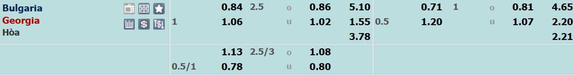 Mặc dù thi đấu trên sân khách nhưng Georgia vẫn được xếp ở cửa trên với tỉ lệ 1:0. Bulgaria rõ ràng không phải lựa chọn đáng tin cậy bởi đội bóng này đã thua kèo châu Á ở 9/10 trận gần nhất trên mọi đấu trường.
