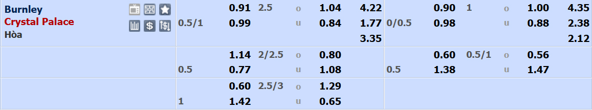 Kèo chấp 3/4:0 đã thể hiện rõ vị thế của Crystal Palace ở trận đấu đêm nay. Giới đầu tư châu Á có lí do để nghi ngờ Burnley bởi đội bóng này với hàng thủ khá tệ đã để thua liên tiếp 4 vòng đấu theo cả tỉ số chuyên môn lẫn tỉ lệ châu Á.