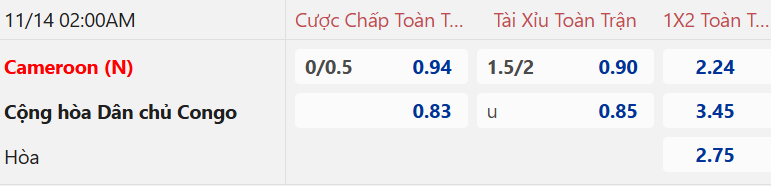 Tỷ lệ hiệp 1 Cameroon chấp về giá và tài xỉu chỉ ở mức 3/4, lại còn bỏ khá sâu. Với cột mốc như vậy thì rất khó kỳ vọng vào việc bàn thắng sẽ xuất hiện trong hiệp thứ nhất trận này. Cameroon chơi thực dụng, công không tốt và 3 trận vừa qua của họ đều chẳng ghi nhận lưới rung lần nào trong thời gian HT.