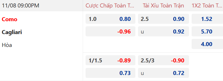 Kèo châu Á nhà cái đưa ra ở mức Como chấp 1 hòa cùng lợi nhuận thấp. Bị 1 đối thủ mới lên hạng chấp ở mức như vậy cho thấy Cagliari hiện tại yếu hơn nhiều so với Como. Xét trên góc độ châu Á, Como có 4 lần thắng kèo trong 5 trận vừa qua, còn Cagliari lại thua tỷ lệ ở 3/4 trận mới đây. Mùa trước thì Como bất bại đồng thời chinh phục thành công rào cản handicap ở cả 2 lượt trận gặp Cagliari.
