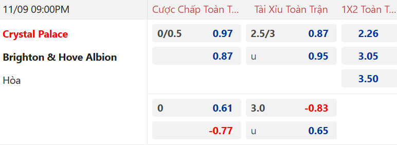 Kèo hiệp 1 trận này chủ chấp về giá ăn ít, trong khi tài xỉu ở mức 1 1/4 có điểm bỏ tương đối sâu cho lựa chọn mốc trên. Nhìn vào handicap cả trận thì tỷ lệ đó có phần khả quan với cửa trên. Crystal Palace thường nhập cuộc tốt và 3 trận vừa qua họ luôn tạo ra lợi thế dẫn bàn khi hiệp 1 khép lại. Còn Brighton thì 3/4 trận sân khách mới đây đều thua trong thời gian HT.