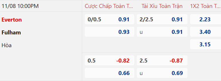 Kèo hiệp 1 trận này có sự dao động giữa mức Everton chấp về giá và chấp 1/4, trong khi tài xỉu 1 hòa có điểm bỏ sâu cho lựa chọn tài. Chiếu theo handicap cả trận thì kèo HT như vậy là chưa khả quan với cửa trên. Nên biết rằng trong cả 8 cuộc đụng độ gần đây giữa đôi bên thì Everton chưa từng tạo ra ưu thế dẫn trước khi hiệp 1 khép lại.