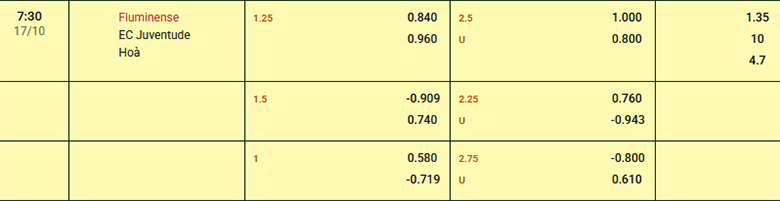 Nhà cái đánh giá khá cao Fluminese và nó được thể hiện qua mức kèo chấp 1 1/4 trái. Đây là tỷ lệ kèo hoàn toàn có thể đặt niềm tin vào đội chủ sân Maracana bởi họ thắng kèo tới 4/5 trận vừa qua khi được thi đấu dưới sự cổ vũ của khán giả nhà. Trong khi đó, Juventude thi đấu không tốt trên sân khách khi thua kèo tới 10/14 trận đã thi đấu.