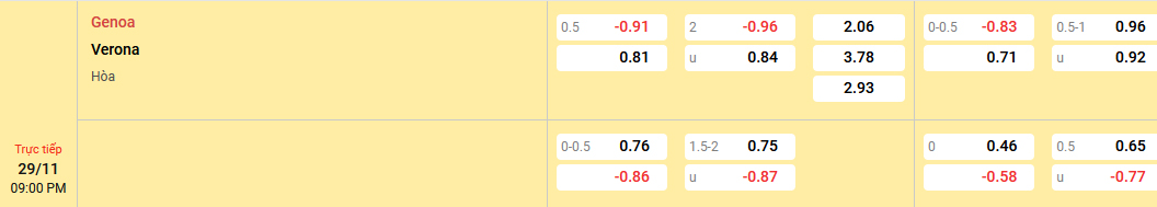 Nhà cái đang niêm yết mức kèo 0:1/2 và nó chứng tỏ Genoa được đánh giá cao hơn Verona. Đây là điều không quá ngạc nhiên bởi đội chủ sân Luigi Ferraris đang thi đấu khá ổn định khi bất bại về kèo châu Á cả 3 trận gần nhất. Trong khi đó, Verona đang trải qua chuỗi 5 trận không thắng kèo trên sân khách. Điều quan trọng nhất là Genoa thắng kèo 6, hoà kèo 2 và chỉ thua kèo 1 trong 9 lần đón tiếp Verona trên sân nhà tại sân chơi cao nhất Italia.