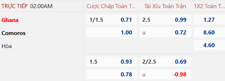 Tỷ lệ hiệp 1 Ghana chấp hòa và tài xỉu ở mức 1 hòa. Có thể hy vọng vào sự cởi mở với định mức nhà cái đưa ra như vậy. Ghana vẫn cần điểm và phải chơi tấn công, trong khi Comoros cũng chẳng chịu sức ép nào để phải thi đấu tử thủ. 3 lần đối đầu mới nhất giữa đôi bên cũng đều chứng kiến bàn thắng ở hiệp 1.
