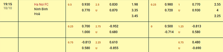 Đang hồi sinh phong độ cùng ưu thế sân nhà nên Hà Nội được xếp làm kèo trên trước Ninh Bình và nó được thể hiện qua mức kèo chấp 1/2 trái. Đây là tỷ lệ kèo rất đáng nghi ngờ bởi đội bóng đến từ Cố đô không phải là đối thủ dễ bị bắt nạt và nó được thể hiện qua việc bất bại cả 6 lượt trận ra quân. Trong khi đó, đội chủ sân Hàng Đẫy mới chỉ thắng kèo có 1 lần sau 6 trận thi đấu ở mùa giải năm nay.