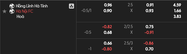 Thị trường châu Á ghi nhận tỷ lệ Hà Nội chấp đến 3/4 trận này với lợi nhuận không lệch là bao giữa các lựa chọn đối lập. Tỷ lệ như vậy là khả quan nếu nhìn vào vị thế hiện tại của đôi bên. Hà Tĩnh chỉ thắng kèo 1/6 trận gần đây trong khi Hà Nội FC vượt qua rào cản châu Á ở cả 2 trận sân khách mới nhất.