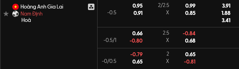 Kèo hiệp 1 trận này Nam Định chấp 1/4 với điểm bỏ, trong khi tài xỉu HT là 1 hòa. HAGL nhập cuộc một cách thực dụng do khả năng tấn công của họ có phần hạn chế. Còn Nam Định trải qua 5 trận liên tiếp không thể ghi bàn trong hiệp thứ nhất. Ở 2 lần đối đầu mới đây giữa đôi bên tại Pleiku thì hiệp 1 đều có tỷ số 0-0.