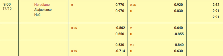 Nhà cái đang niêm yết mức kèo hòa được thua và nó chứng tỏ cơ hội giành chiến thắng được chia đều cho hai đội. Với mức kèo này, người chơi châu Á nên nằm kèo Alajuelense bởi họ đang rất hưng phấn sau khi lọt vào bán kết Cup Liên đoàn Bắc Mỹ. Trong khi đó, Herediano đang gặp khó khi thua kèo tới 4/5 trận gần nhất.