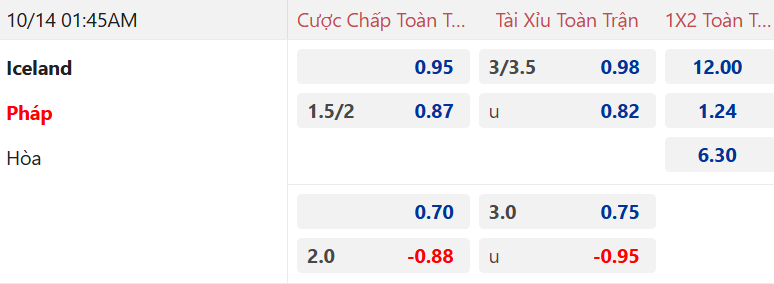 Kèo châu Á nhà cái đưa ra ở mức Pháp chấp 1 3/4 với lợi nhuận không chênh quá nhiều giữa các lựa chọn. Nhìn qua thì có thể thấy mức handicap đó chưa hẳn là khả quan dành cho Pháp. Nếu như Iceland thắng kèo 2/3 lượt trận đã qua thì Pháp lại thua về châu Á ở cả 2 trận mới đây. Dù lấn lướt về đối đầu nhưng nên nhớ ở 2 cuộc đụng độ với Iceland gần nhất, Pháp đều không thể thắng trên góc độ châu Á.