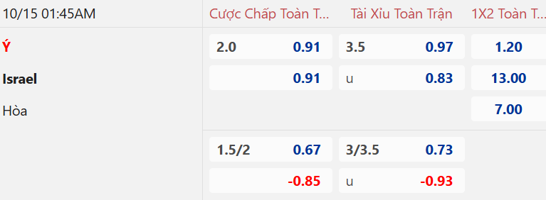 Tỷ lệ hiệp 1 trận này giới cầm cân nảy mực đưa ra ở mức chủ chấp 3/4 ăn ít và tài xỉu HT lên tới 1 1/2, cột mốc tương đối cao. Italia cũng như Israel nhập cuộc khá cởi mở và 2 trận gần đây của Italia cũng như 3 trận vừa qua của Israel đều có tối thiểu 2 bàn trong hiệp đấu đầu tiên. Vì thế, nên tin vào cửa tài HT trận này.