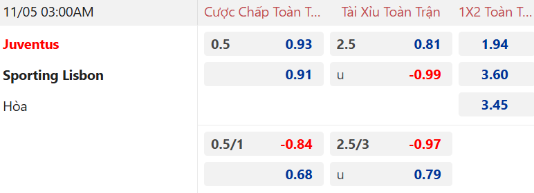 Tỷ lệ hiệp 1 được đưa ra ở mức chủ chấp 1/4 cùng điểm bỏ đôi chút và tài xỉu HT dao động giữa 1 hòa tới 1 1/4. Nhìn vào handicap cả trận thì có thể thấy mức chấp như vậy ở thời gian HT chưa thực sự khả quan với Juventus. Họ thường bắt nhịp khá chậm và thường chỉ khởi sắc trong hiệp 2. Trong 4 lần gặp Sporting Lisbon gần đây thì Juventus cũng chưa từng tạo ra ưu thế dẫn bàn sau hiệp 1.