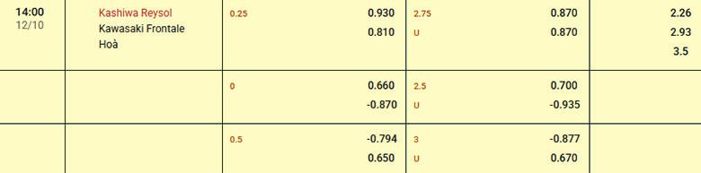 Nhà cái vẫn đánh giá khá cao Kashiwa Reysol và nó được thể hiện qua mức kèo chấp 1/4 trái. Đây là tỷ lệ kèo không thực sự an toàn nếu nằm kèo đội chủ nhà bởi thành tích đối đầu không ủng hộ. Cụ thể, đội bóng này đang trải qua chuỗi 10 trận liên tiếp không biết mùi chiến thắng trước Kawasaki Frontale. Hơn nữa, đội khách cũng đang có chuỗi 6 trận bất bại liên tiếp trên sân khách.