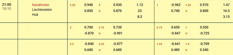 Nhà cái đánh giá Kazakhstan ở thế cửa trên trước Liechtenstein và nó được thể hiện qua mức kèo chấp 2 hòa. Đây là tỷ lệ khó bởi đội bóng này mới chỉ ghi được 3 bàn sauu 5 lượt trận ra quân. Trong khi đó, Liechtenstein thắng kèo tới 6/10 trận hành quân xa nhà.