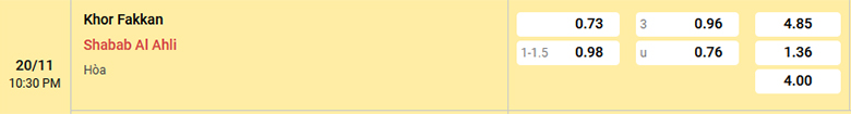 Nhà cái đánh giá rất cao Shabab Al Ahli trong chuyến làm khách trên sân của Khor Fakkan và nó được thể hiện qua mức kèo chấp 1 1/4 trái. Đây là tỷ lệ kèo rất đáng nghi ngờ, bởi đội chủ nhà thắng kèo 4 trận liên tiếp vừa qua. Trong khi đó, Shabab Al Ahli thua kèo cả 3 trận gần nhất. Hơn nữa, đội khách cũng cần giữ sức cho sân chơi Cup C1 châu Á vào đầu tuần tới. Do đó, nằm kèo đội chủ nhà với kèo được chấp 1 1/4 trái sẽ là sự lựa chọn an toàn cho người chơi châu Á.