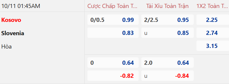 Tỷ lệ hiệp 1 nhà cái đưa ra có sự dao động giữa kèo Kosovo chấp về giá và chấp 1/4. Chiếu theo handicap cả trận thì tỷ lệ HT đó là khả quan với Kosovo. Trừ trận cầu với Thụy Sĩ thì 5/6 lần xuất quân vừa qua, Kosovo luôn ghi được bàn ở hiệp thứ nhất. Slovenia nhập cuộc một cách chậm chạp và 2 trận mới đây họ đều bị dẫn bàn khi hiệp 1 khép lại.