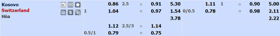 Mặc dù thi đấu trên sân khách nhưng Thụy Sỹ vẫn được xếp ở cửa trên với tỉ lệ 1:0. Với kèo chấp này, đội bóng xứ sở đồng hồ xứng đáng được tin tưởng. Thực tế, thầy trò Yakin đang thể hiện phong độ rất cao với 7 chiến thắng ở 8 trận gần nhất theo cả tỉ số chuyên môn lẫn tỉ lệ châu Á, trong đó có trận thắng Kosovo 4-0 ở lượt đi.
