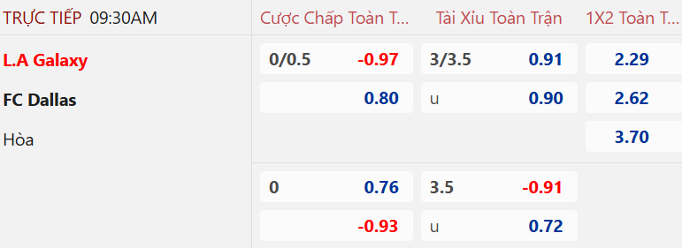 Kèo châu Á chấp 1/4 cùng điểm bỏ không phải tỷ lệ khả quan dành cho LA Galaxy trận này. LA Galaxy chỉ thắng kèo 1 trong số 4 trận gần nhất, còn Dallas có 8 trận liền không thua trên phương diện châu Á, trong đó họ thắng tỷ lệ tới 7 trận. Dallas cũng tỏ ra lấn lướt về đối đầu khi giành tới 6 chiến thắng ở 7 lần đụng độ với LA Galaxy thời gian qua.