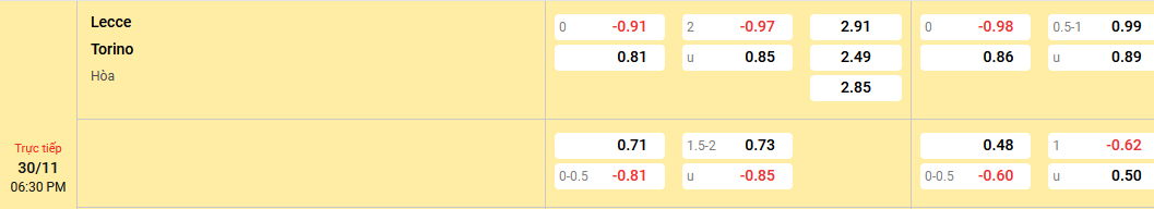 Nhà cái đang niêm yết mức kèo hoà được thua và nó chứng tỏ cơ hội giành chiến thắng được chia đều cho hai đội. Đây là tỷ lệ kèo vẫn nên đặt niềm tin vào Torino bởi họ thắng kèo tới 5/7 trận vừa qua và 4/5 trận xa nhà. Trong khi đó Lecce chưa có lấy nổi một trận thắng khi được thi đấu trên sân nhà ở mùa giải năm nay.