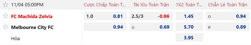 Machida Zelvia được xếp ở cửa trên với kèo chấp 0:1 nhờ phong độ rất cao tại sân nhà. Nhưng ở 10 trận gần nhất trên mọi đấu trường, đội bóng Nhật Bản chỉ 2 lần thắng kèo châu Á. Họ cũng thua handicap ở 3/4 trận sân nhà gần nhất. Ngược lại, Melbourne City đã thắng kèo châu Á ở 4/5 trận gần đây, có cơ sở để tin tưởng khả năng tạo bất ngờ.