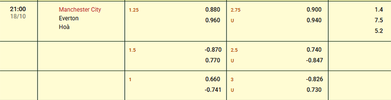 Nhà cái đang niêm yết mức kèo 0:1 1/2 và nó chứng tỏ Man City được đánh giá cao hơn Everton rất nhiều. Đây là điều không ngạc nhiên bởi thầy trò HLV Pep Guardiola thắng kèo tới 6/8 lần gần nhất tại tổ ấm của mình. Trong khi đó, Everton thua kèo tới 4/6 trận rời xa tổ ấm. Điều quan trọng nhất là The Citizen thắng kèo tới 7/10 lần so tài giữa 2 đội.