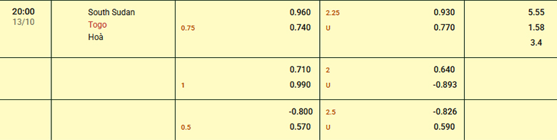 Nhà cái vẫn xếp Togo ở thế cửa trên và nó được thể hiện qua mức kèo chấp 3/4 trái. Đây là tỷ lệ kèo rất đáng nghi ngờ bởi đội bóng này thua kèo tới 6, hòa kèo 1 và chỉ thắng kèo 1 trong 8 trận hành quân xa nhà. Trong khi đó, Nam Sudan thắng kèo 3/5 trận gần nhất khi được thi đấu dưới mặt sân quen thuộc. Điều quan trọng nhất là Togo để đối thủ này cầm chân với tỷ số 1-1 ngay trên sân nhà trong trận lượt đi vòng loại World Cup 2026 khu vực châu Phi.