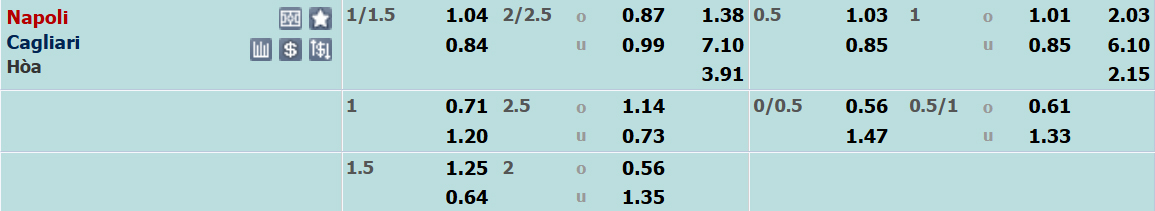 Kèo chấp 0:1 1/4 đã thể hiện rõ vị thế vượt trội của Napoli. Giới đầu tư châu Á có thể tin tưởng thầy trò Conte bởi họ đã thắng cả 3 trận gần nhất theo cả tỉ số chuyên môn lẫn tỉ lệ châu Á.