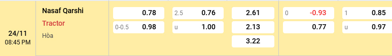 Dù có ưu thế về mặt sân bãi, nhưng nhà cái vẫn đánh giá Nasaf ở thế cửa dưới trước Tractor và nó được thể hiện qua mức kèo được chấp 1/4 trái. Đây là tỷ lệ kèo nên nằm đại diện đến từ Iran bởi họ thi đấu khá tốt trên sân khách khi thắng kèo 8/10 trận gần nhất, bao gồm 2 trận tại sân chơi Cup C1 châu Á. Trong khi đó, Nasaf đang chìm trong khủng hoảng khi thua kèo cả 6 trận gần nhất và có 2 trận ở đấu trường AFC Champions League.