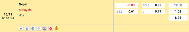 Nhà cái đang niêm yết mức kèo 2 3/4:0 và nó chứng tỏ Malaysia được đánh giá cao hơn rất nhiều so với Nepal. Đây là tỷ lệ kèo vẫn nên đặt niềm tin vào Hổ vàng bởi họ thắng kèo tới 5/6 trận gần nhất. Trong khi đó, Nepal thua kèo 3 và hoà kèo 1 trong 4 trận gần nhất khi được thi đấu dưới mặt sân quen thuộc. Bên cạnh đó, họ thua tới 4/5 lần so tài giữa 2 đội.