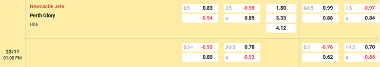 Dù có phong độ không tốt nhưng Newcastle Jets vẫn được nhà cái xếp làm cửa trên trước Perth Glory và nó được thể hiện qua mức kèo chấp 1/2 trái. Đây là điều không quá ngạc nhiên bởi đội khách đang chìm sâu trong cuộc khủng hoảng khi thua kèo cả 8 trận gần nhất trên mọi sân chơi. Điều quan trọng nhất là Newcastle Jets thắng kèo tới 7/10 lần so tài giữa 2 đội.