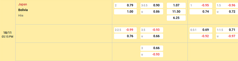 Nhà cái đánh giá cơ hội giành chiến thắng của Nhật Bản cao hơn rất nhiều so với Bolivia và nó được thể hiện qua mức kèo chấp 2 hoà. Với mức kèo này vẫn có thể đặt niềm tin vào chiến binh Samurai bởi họ vừa thắng kèo cả 2 trận gần nhất trước các đối thủ mạnh như Ghana hay Brazil. Trong khi đó, sân khách vẫn là nỗi ám ảnh với Bolivia bởi họ thua kèo cả 7 trận gần nhất.