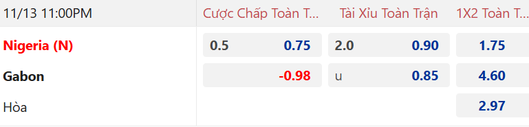 Thị trường châu Á ghi nhận tỷ lệ Nigeria chấp hòa trận này cùng điểm ăn thấp. Dù cho đối thủ đang có phong độ cao thì việc Nigeria chấp ở mức như vậy là rất khả quan dành cho “đại bàng xanh”. Nigeria thực tế cũng thắng 4 và hòa 1 trong 5 trận vừa qua, phong độ không thua kém đối thủ. Ở lần đối đầu mới nhất thì Nigeria từng vượt qua Gabon với tỷ số 2-0. Hơn nữa, khách quan mà nói thì lực lượng của Nigeria vẫn được đánh giá nhỉnh hơn.