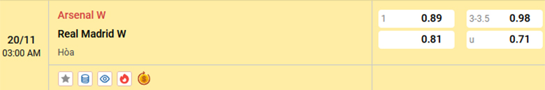 Nhà cái vẫn đánh giá khá cao nữ Arsenal trong màn tiếp đón nữ Real Madrid và nó được thể hiện qua mức kèo chấp 1 hoà. Đây là tỷ lệ kèo khó với nữ Pháo thủ bởi họ thua kèo tới 9/10 trận vừa qua, trong đó có 3 trận tại sân chơi Cup C1 châu Âu. Trong khi đó, nữ Real Madrid thắng kèo 4/5 trận đã thi đấu tại sân chơi danh giá nhất châu Âu.