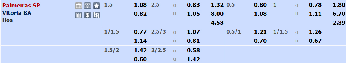 Kèo chấp 0:1 1/2 đã thể hiện rõ vị thế của Palmeiras ở trận đấu này. Giới đầu tư châu Á có thể tin tưởng Palmeiras bởi họ đã thắng 7/8 trận sân nhà gần nhất theo cả tỉ số chuyên môn lẫn tỉ lệ châu Á, trong đó có 3 trận xuất hiện kèo chấp 0:1 1/2. Ngược lại, Vitoria BA đã thua 6/7 trận sân khách gần nhất.