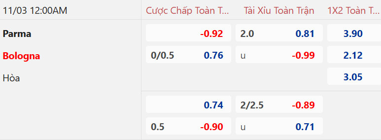 Tỷ lệ hiệp 1 khách chấp 1/4 bỏ khá sâu và tài xỉu HT chỉ dừng lại ở mức 3/4. Cột mốc thấp khiến khả năng xuất hiện bàn trong hiệp 1 là không cao. Parma công kém đã đành, Bologna cũng chơi rất thực dụng và 6 trận gần đây thì họ không lọt lưới bàn nào ở hiệp thi đấu đầu tiên.