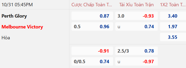 Thị trường châu Á chứng kiến tỷ lệ Melbourne Victory chấp hòa trận này, kèo tương đối khả quan trong bối cảnh họ phải làm khách. Perth Glory không đáng tin chút nào khi toàn thua về khía cạnh châu Á ở 5 trận gần đây, còn Melbourne Victory chỉ thua tỷ lệ 1/3 trận vừa qua. Melbourne Victory cũng áp đảo về đối đầu khi toàn thắng 7 lần gặp Perth Glory mới nhất.